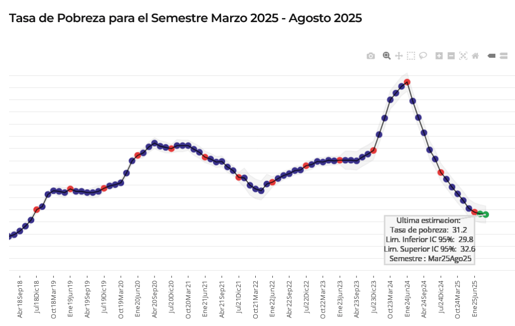 Este es el gráfico más importante a tener en cuenta, donde vamos a ver que después de los ajustes realizados en el gobierno argentino, la tasa de pobreza se estabiliza y continua en descenso.
