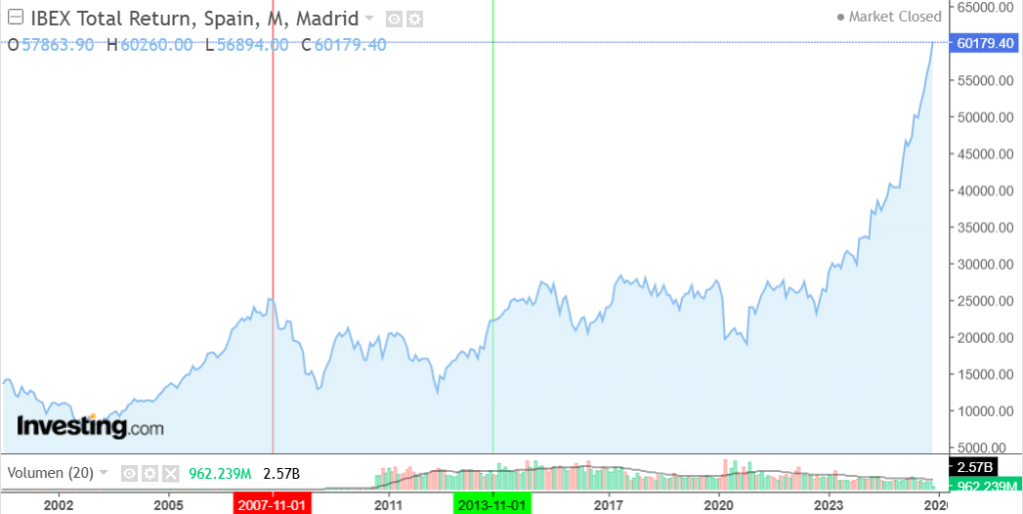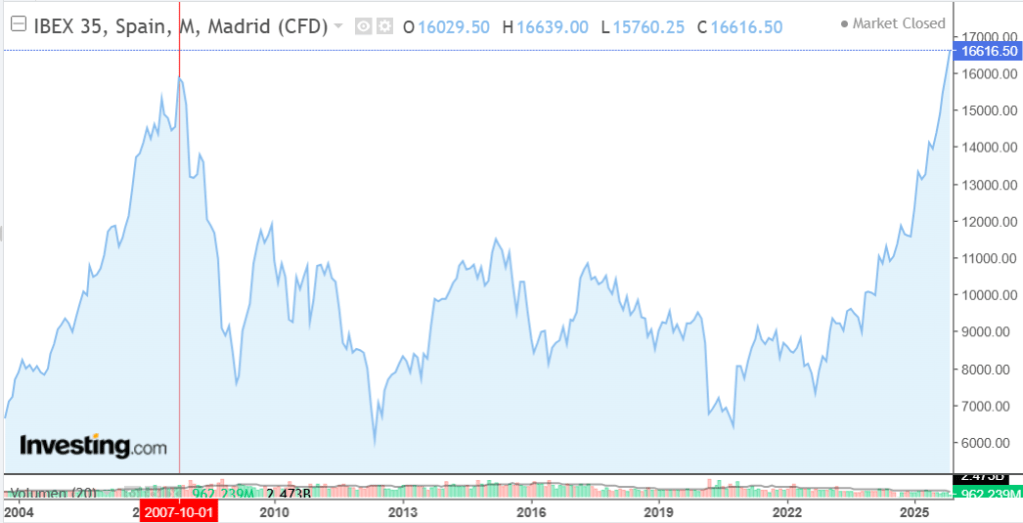 Con la línea roja marco el año 2007, en plena burbuja inmobiliaria (financiera), y según este gráfico, podríamos decir que 18 años después hemos vuelto a los valores precrisis, o que una persona que hubiera invertido en 2007 ha tardado en recuperar su inversión 18 años, y no es así.